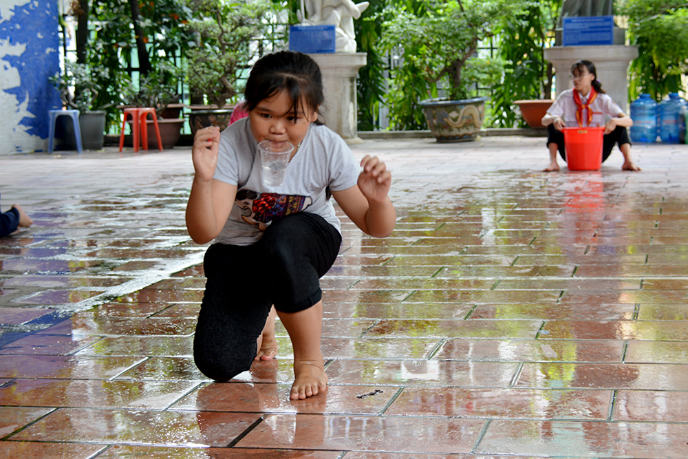 Cuối cùng là tiết mục leo qua cửa sổ (cách thoát hiểm). Các anh chị HT dựng các chồng ghế nhựa tạo thành lối đi cho các em, sau đó lấy khăn bịt miệng và giúp các em trèo qua cửa sổ để thoát ra khỏi nhà thờ một cách an toàn và nhanh nhất.
