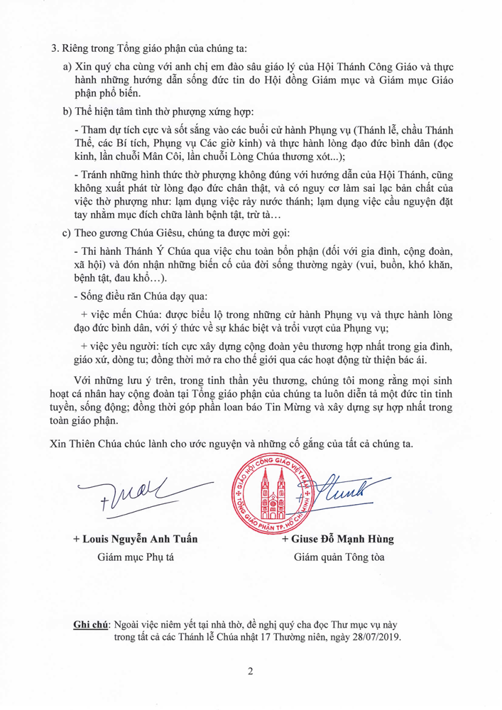 Ghi chú: Ngoài việc niêm yết tại nhà thờ, đề nghị quý cha đọc Thư mục vụ này trong tất cả các Thánh lễ Chúa nhật 17 Thường niên, ngày 28/07/2019.