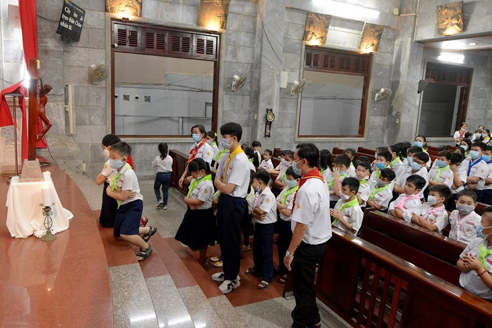 Sau đó, các em thiếu nhi và cộng đoàn xếp thành hai hàng lần lượt tiến lên Cung thánh quỳ gối bái lạy Thánh giá Chúa Giêsu.